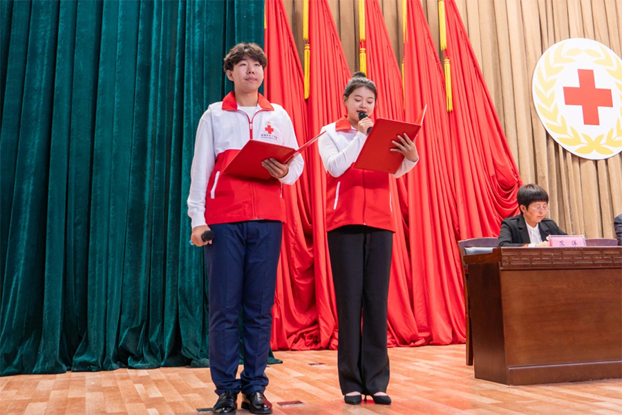 校红十字会常务理事为新会员代表佩戴红十字会徽章。这象征着新会员正式加入红十字会大家庭,每一枚徽章都承载着荣誉与使命,传递着人道主义精神的接力棒。